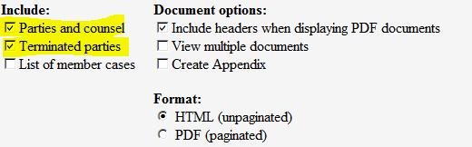 Are you interested in thriftily finding out what the latest 3 filings are in a case—don’t forget to uncheck the auto-selected “Parties and counsel” and “Terminated parties” because you will be charged for the docket pages associated with this top matter. This criteria is automatically selected, and of course, costs $0.10 a page, and for multi-party cases with large litigation teams, this can quickly number many pages.