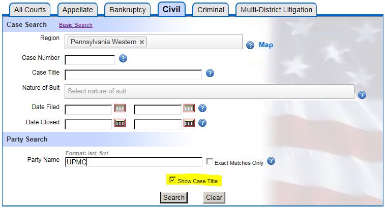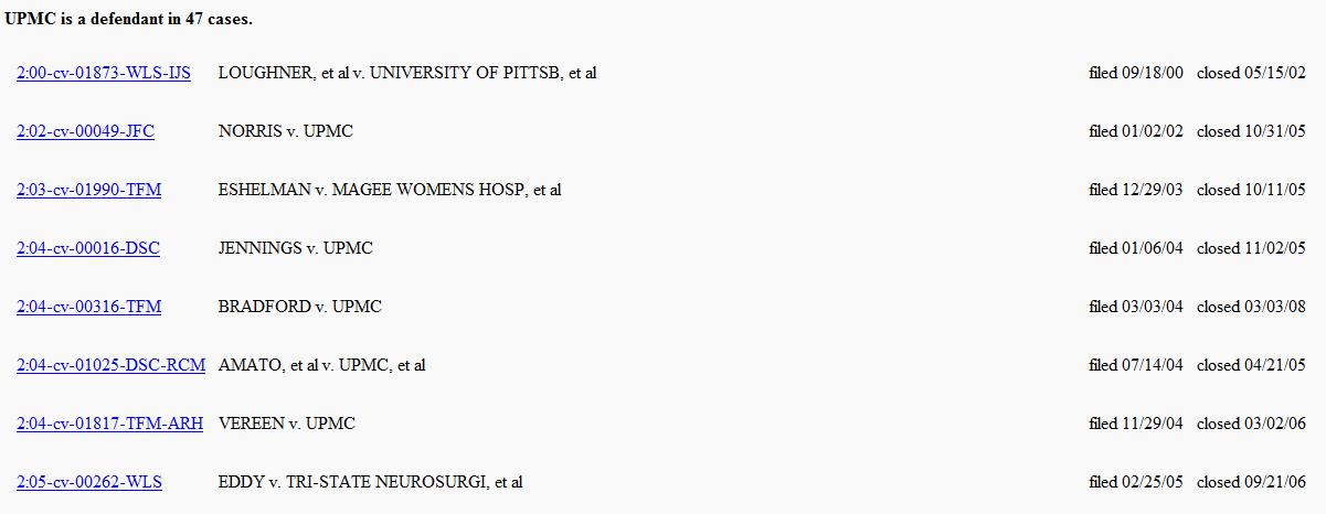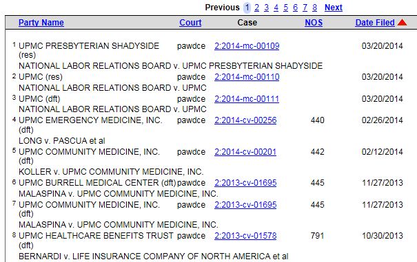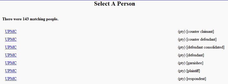 If you have a party, and the correct court, searching within that specific court’s PACER interface can be maddening. The reason why: the party role of the search will be displayed first. Here’s an example search for UPMC, showing 7 events with UPMC in 7 different roles (counter-claimant, counter-defendant, etc.).