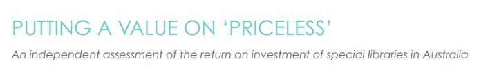 A collection of Australian library groups collaborated to fund a ROI study on the value of Special Librarians (available here, and the library groups’ summary is available here). Special Librarians are defined in this study as librarians working in health, law, government, business, industry, media, and other commercial or industry groups with a very specific patron-base. The study was conducted by SGS Economics and Planning, an Australian planning and economics firm. The study concluded that for every dollar invested, special librarians return $5.43. The study indicates this might even be a low estimate.