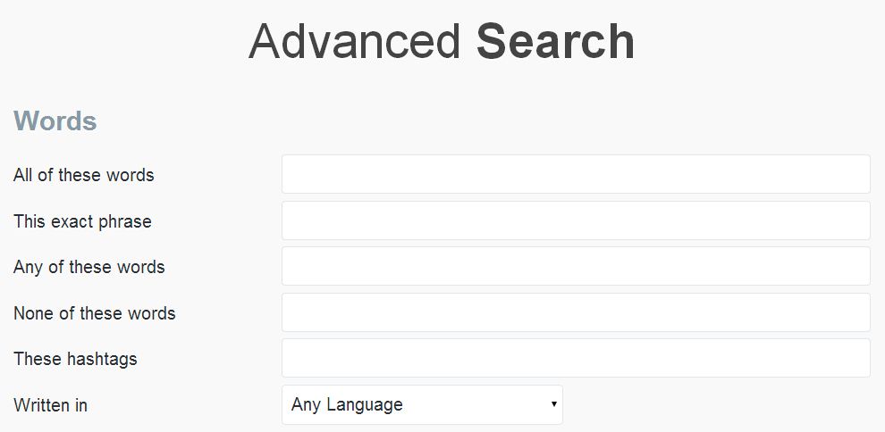 Twitter is currently the 8th most popular website on planet earth, according to Alexa. And, luckily for our purposes, Twitter provides an advanced search screen that does not require the user to log in! This is accessible here: https://twitter.com/search-advanced