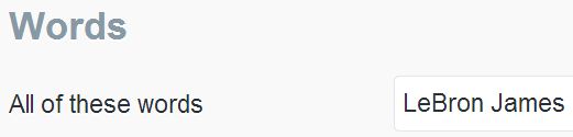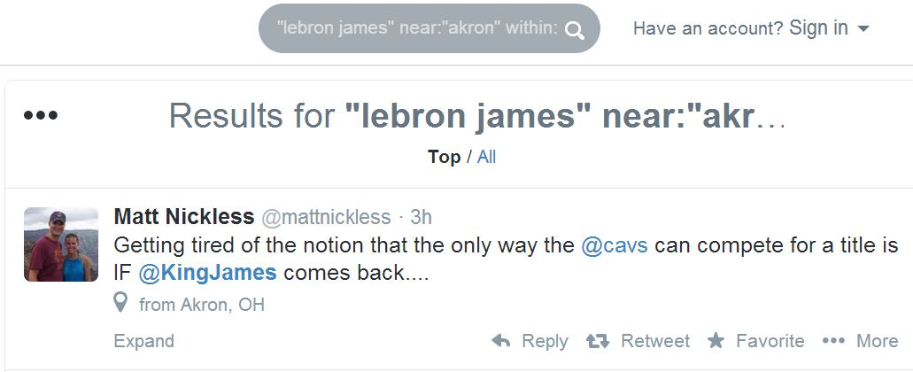 When a user has a common name or does not have their first and/or last name in their Twitter handle, the next best option is to do a phrase search for the user’s name. Using this search method will retrieve instances where the user’s full name has been tweeted–it may not necessarily be tweeted by the user you are trying to find, but it may just be the information you need to get one step closer to finding out what your user’s Twitter handle is. Also, doing this search can retrieve instances where a Twitter handle has been tweeted that, behind the scenes, is linked to the user’s real name, as we will see in our example. Let’s say, we are trying to find tweets mentioning “LeBron James”, to locate LeBron James’s Twitter handle. To improve the relevancy, we were also given the additional information that the location of “LeBron James” may be “Akron, OH”, so we can add that to the search as well. We would enter “LeBron James” into the “All of these words” portion of the advanced search field: