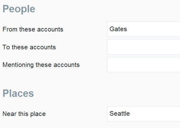 More often than not, you will be tasked with finding somebody with a more common name and a location. These searches can be accomplished by, again, using Twitter’s advanced search page, and by inputting the data you have under “People” and “Places.” Let’s say we are tasked with finding a person with the name of “Gates”, in the city of Seattle, WA. Merely input “Gates” into the “People” field, and “Seattle” into the “Places” field: