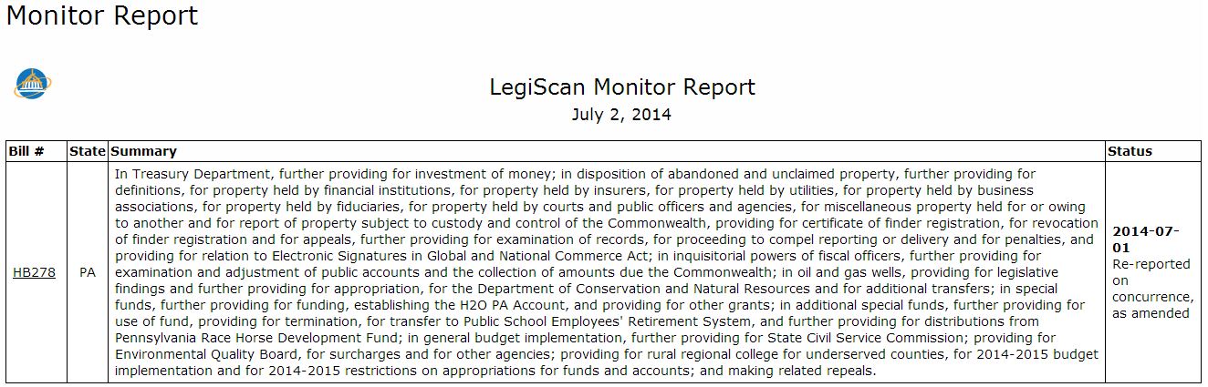 LegiScan_WeeklyAlertSetUpAnd, here’s an example of what the e-mailed alert looks like: