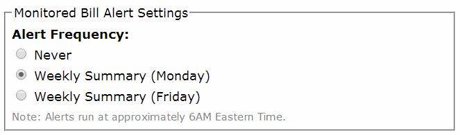 Once the track has been created, the user will be e-mailed a monitor report providing the latest status of the bill on a once-a-week basis. Again, note at this tier that daily alerts or real-time alerts are not available–the alerts are delivered weekly. By clicking the option “alerts” in a left-column navigation pane, the user has the option to set up receiving their e-mail alert on either Monday or Friday (with delivery typically at 6:00 a.m. EDT):