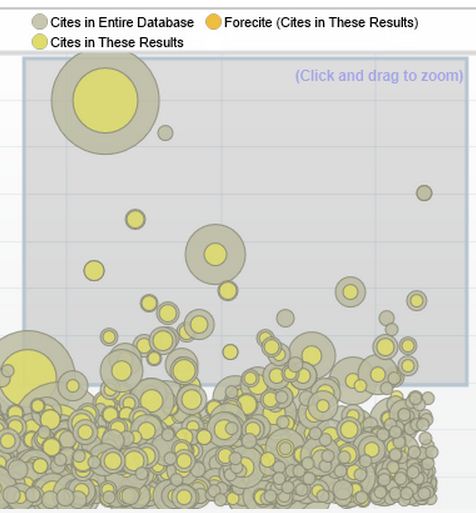 In this visualization, relevancy is based on the number of citing references. Furthermore, three modes of relevancy rankings are graphically visualized: number of times a case has been cited from all of the cases in Fastcase, number of times a case has been cited from other cases in this results list, and the Forecite results. Forecite, introduced by Fastcase back in 2010, are results which may not contain the specific query the user input, but which are cited by the other cases in the results list, and therefore may be relevant.